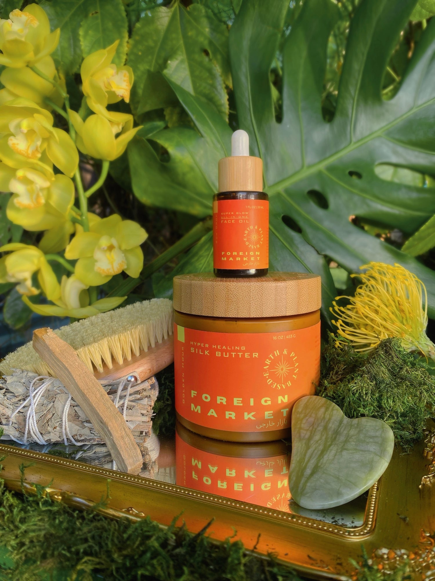 This curated set of products and body tools is your starter kit to restoring your skin to a more supple state. Elevate your self-care experience by making it a ritual; Cleanse your space & set the mood with the fresh and deep aroma of burning sage & palo santo. Next, prep your skin for optimal absorption by exfoliating with our vegan bristle body brush made from agave sisal fibers. Lastly, after your warm shower or bath, bask in the silkiness of our Hyper Healing Silk Butter and Super Glow Face Oil; taking your time to massage in all that herbal goodness. Use your favorite body & face sculpting tools for optimal results.